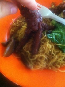 Hier in Singapore gibt es eine Unmenge von Food Courts. Dort gibt es aus den diversen asiatischen Ländern (Malysia, Indonesien, Korea, China, Japan, Vietnam, Indien, ...) Gerichte an kleinen Ständen die direkt vor einem zubereitet werden (Ich mache nächstes Mal ein Foto wie solch ein Food Court aussieht). Gestern war ich nach der Uni noch eine Kleinigkeit essen (rechts im Bild) habe aber nicht den kompletten Titel des Gerichts gelesen, sondern nur das Bild und das Wort CHICKEN gesehn. Das sah sehr lecker aus also habe ich es bestellt. Bei der Zubereitung sah das Fleisch etwas komisch aus, also habe ich nochmals genauer hingeschaut. Und da stand tatsache CHICKEN FEET. Im endeffekt hat es ganz gut geschmeckt und war auch super gewürzt (In den Kommentaren noch eine Nahaufnahme des Gerichts). Ob ich es nochmals Essen werde, weis ich noch nicht :D vom Geschmak her ja, von den Gedanken beim Essen eher nein.
